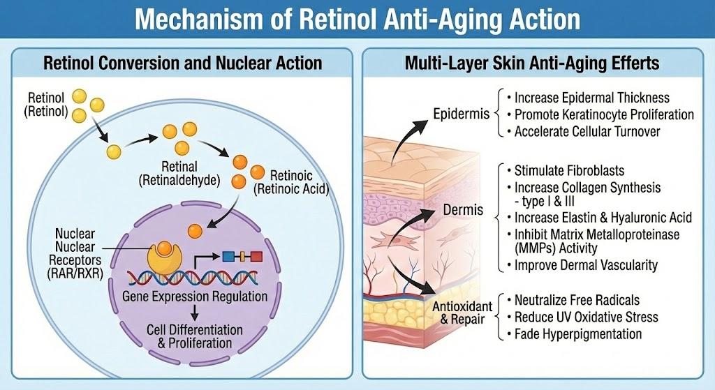 首先,視黃醇與皮膚細胞內的核受體結合,激活一系列基因轉錄,促進膠原蛋白與細胞外基質蛋白的生成。簡言之,它直接「命令」妳的皮膚開始製造膠原——這是人體自然抗衰老的終極方案。