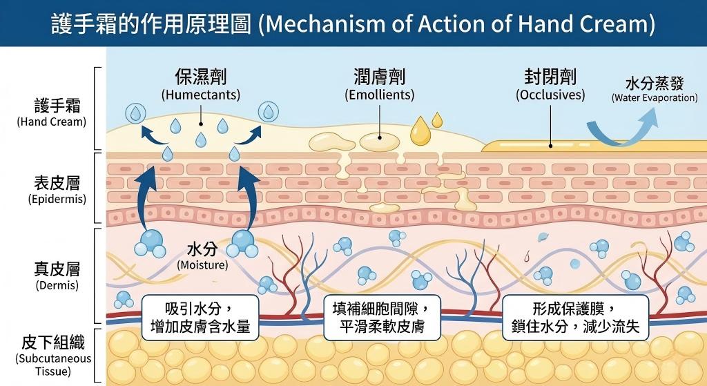 洗手後立即涂護手霜(趁皮膚還有水分),能鎖住水分。選擇高保濕配方含玻尿酸、神經酰胺。夜間則用凡士林(Petroleum Jelly)封閉保濕——凡士林的優勢是極度抗水性,即使洗手也仍有效果。