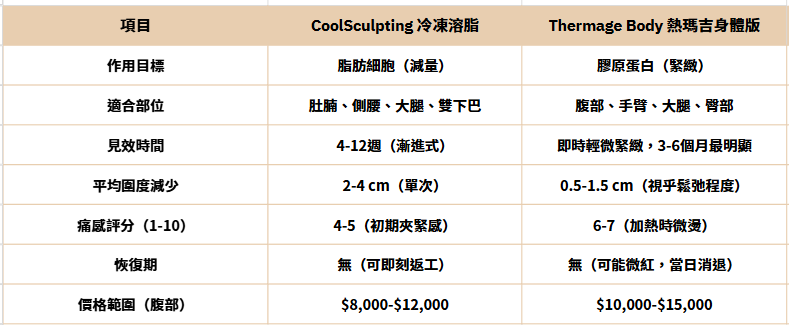 如果你兩者都有 → 先CoolSculpting減脂,3個月後Thermage Body緊緻(黃金組合!)