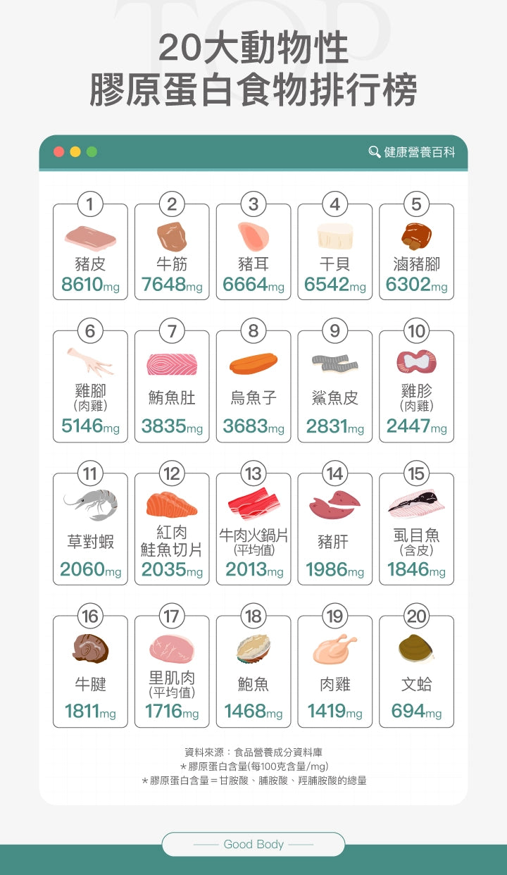 「食豬腳補膠原」係最多人問嘅迷思之一:動物性膠質食物(如豬腳、雞翅、魚皮、牛筋等)確實含膠原蛋白,但呢類食物往往脂肪含量較高,唔適合經常食。