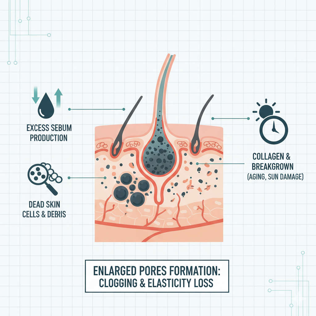 角質型毛孔粗大係因為角質層堆積、毛孔阻塞。如果你平時清潔唔夠徹底,或者長期唔做去角質,死皮同老廢角質就會喺毛孔周圍同毛孔入面積累。呢啲角質會氧化變黑(黑頭其實係氧化咗嘅油脂同角質),導致毛孔越嚟越大,膚質變得粗糙。