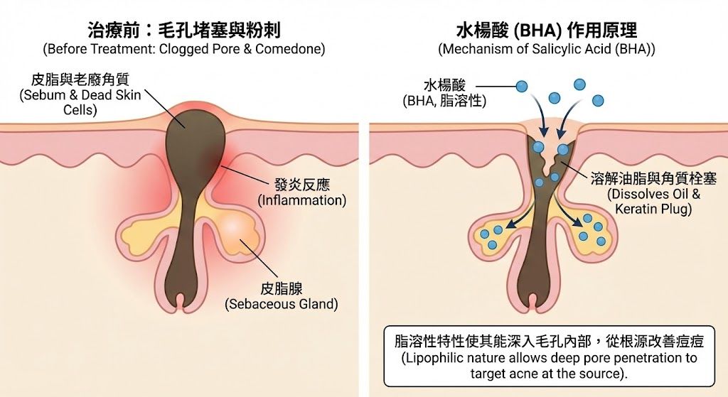 水楊酸是脂溶性的(油溶性),這是它區別於果酸(AHA,水溶性)的根本優勢。脂溶性意味著水楊酸能溶解毛孔內積聚的油脂與老廢角質,直接作用於痘痘的根源——被油脂與死皮細胞堵塞的毛孔。