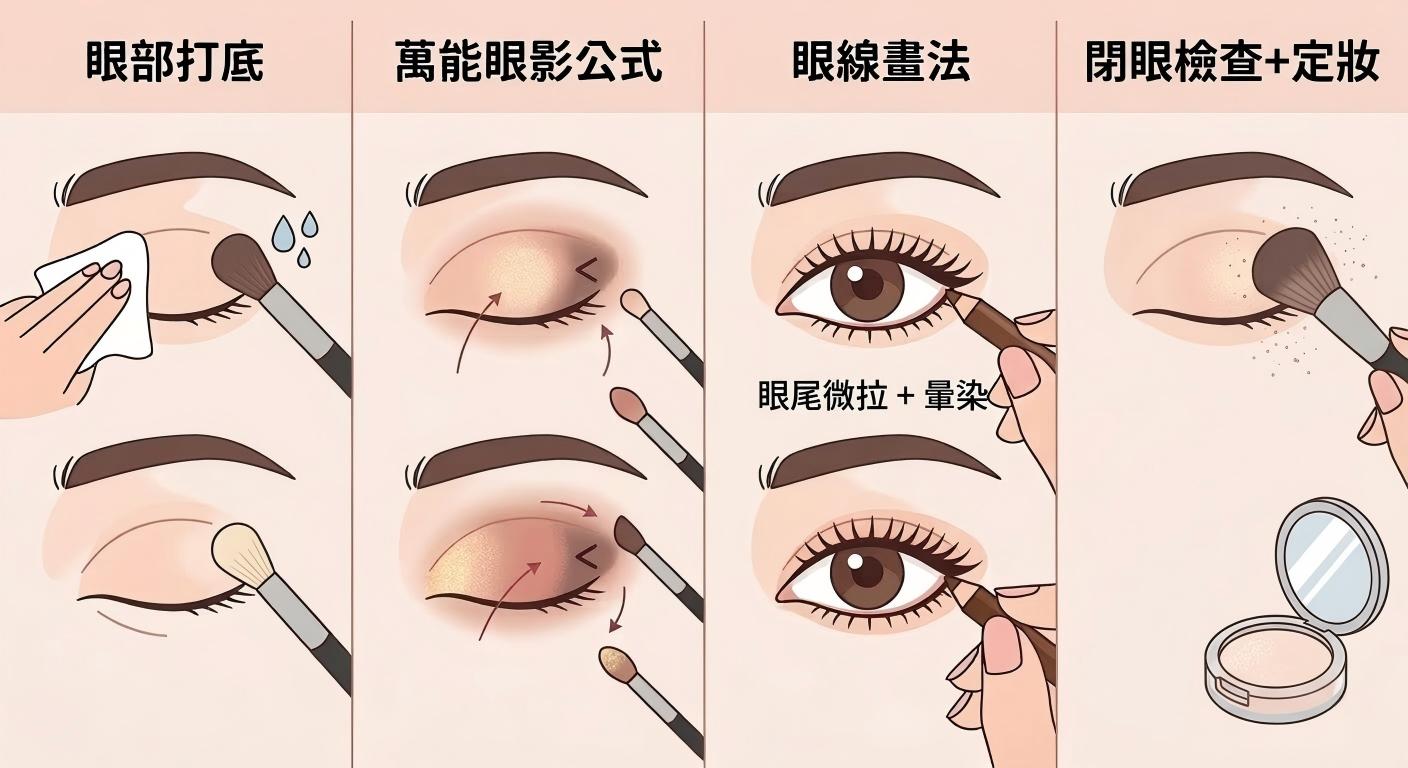 Step 2:萬能眼影公式——打底色 → 主色 → 加深色 → 提亮色