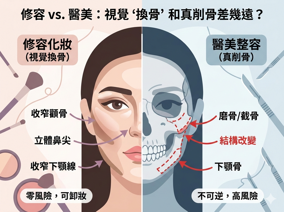 不少醫美專家都提醒,削骨是「不可逆」的,後悔難以挽回,並不是輕易可以嘗試的瘦臉方法。 相比之下,修容化妝屬於「零風險可卸妝」的視覺調整,而醫美整形才是直接動到骨頭和組織,兩者的風險和成本完全不在同一層級。